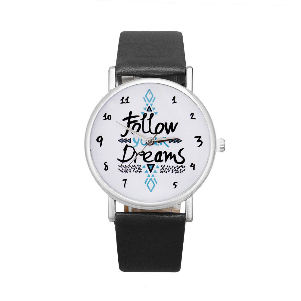 Vico 2018 New Fashion Women Watch Follow Dreams Words Pattern PU Leather Quartz Analog Wrist Watches