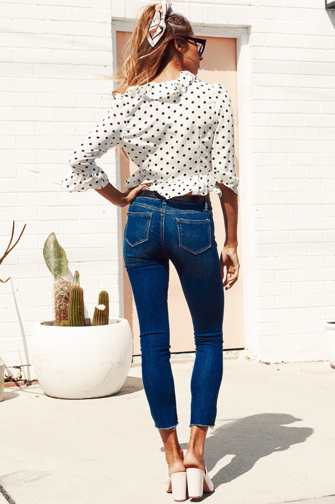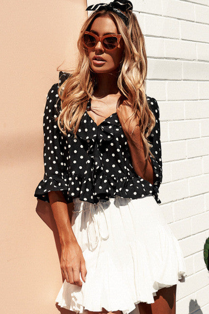 MisShow White Chiffon Women Blouse V Neck Sexy Tops Femme Wave Butterfly Sleeve Slim Tops Polka Dot Ruffle Women's Blouse Shirt
