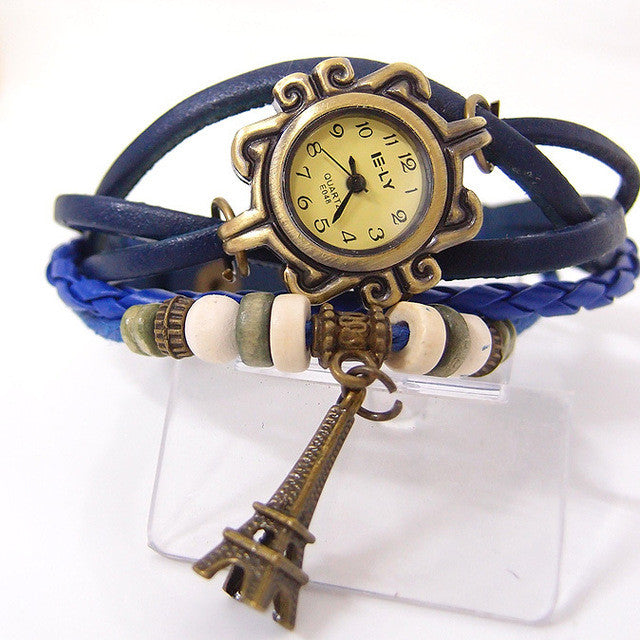vintage Eiffel Tower tag fashion quartz watch women genuine cow leather beads bracelet wrist watch